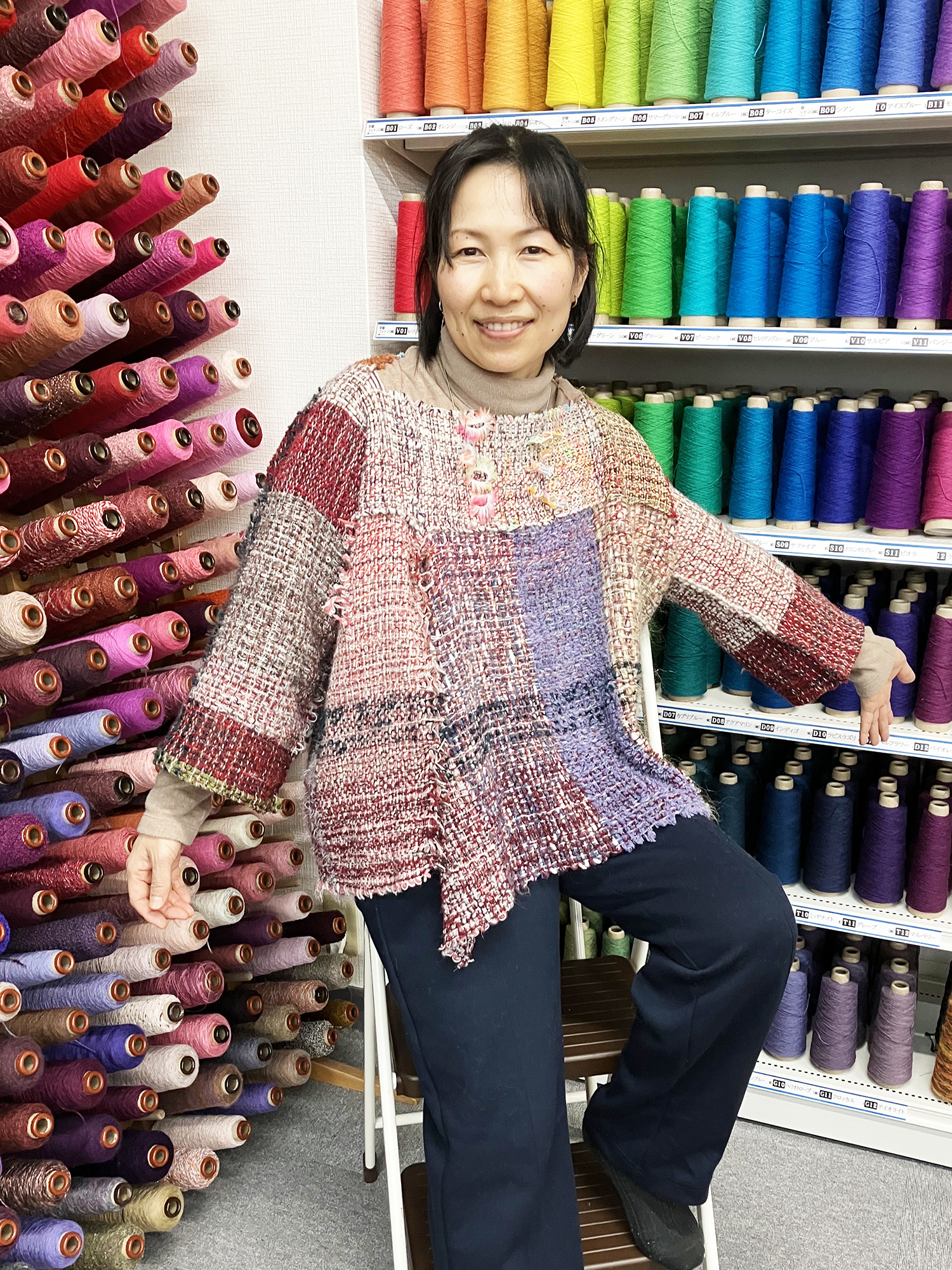 「パンツに仕立てたい」とお持ちになった布でしたが、大きな『分け織り』や粗い部分があり、しかも長さが短い!この布を個性を活かすためには…と考えた末、不都合を好都合に昇華させて完成した作品です。