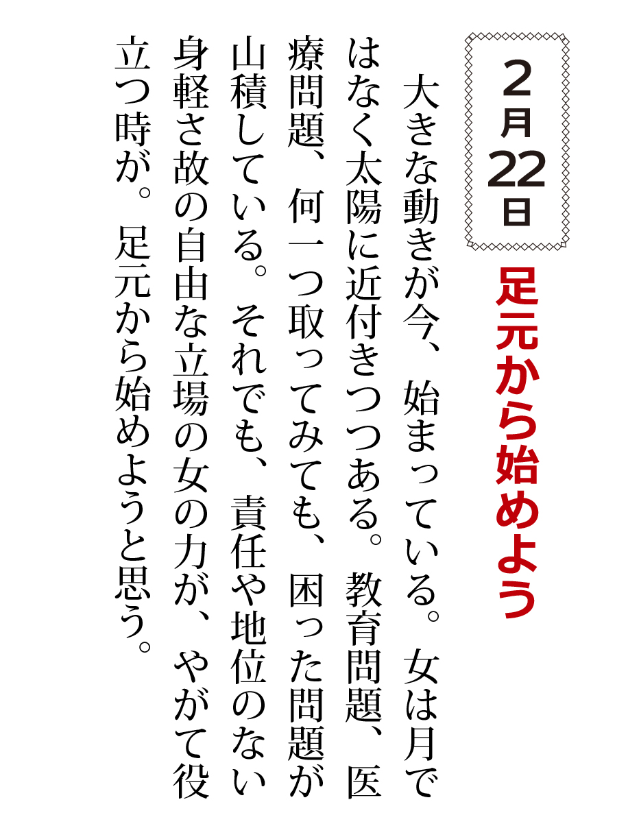 大きな動きが今、始まっている。女は月ではなく太陽に近付きつつある。教育問題、医療問題、何一つ取ってみても、困った問題が山積している。それでも、責任や地位のない身軽さ故の自由な立場の女の力が、やがて役立つ時が。足元から始めようと思う。