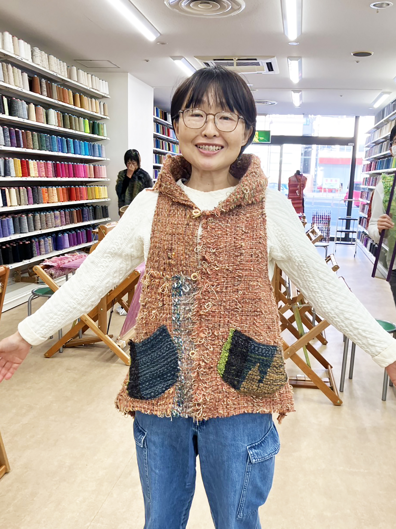 さをり織りのお仕立ての中でも人気の『イカベスト』をショート丈にアレンジされて、ポケットが素敵なアクセントになっています。