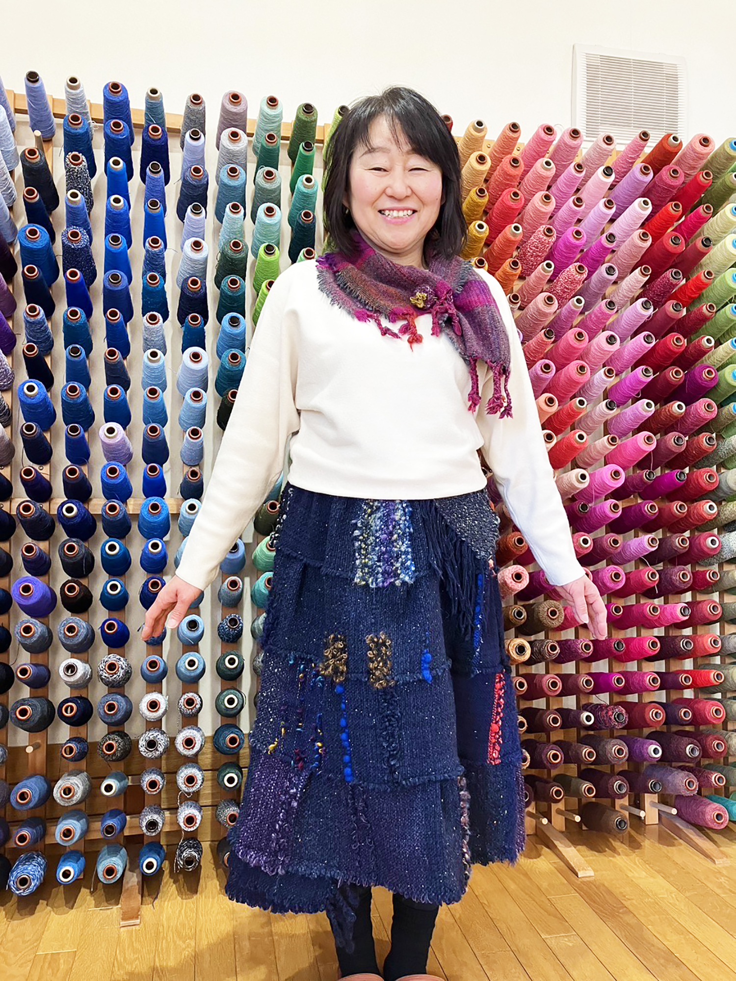 細幅の布をぐるぐる回しながら仕立てる『らせんスカート』を完成されました。出来上がりサイズを調整しながら、何度もピンを打ち直されていましたが、その甲斐あって、とても素敵な仕上がりとなりました。