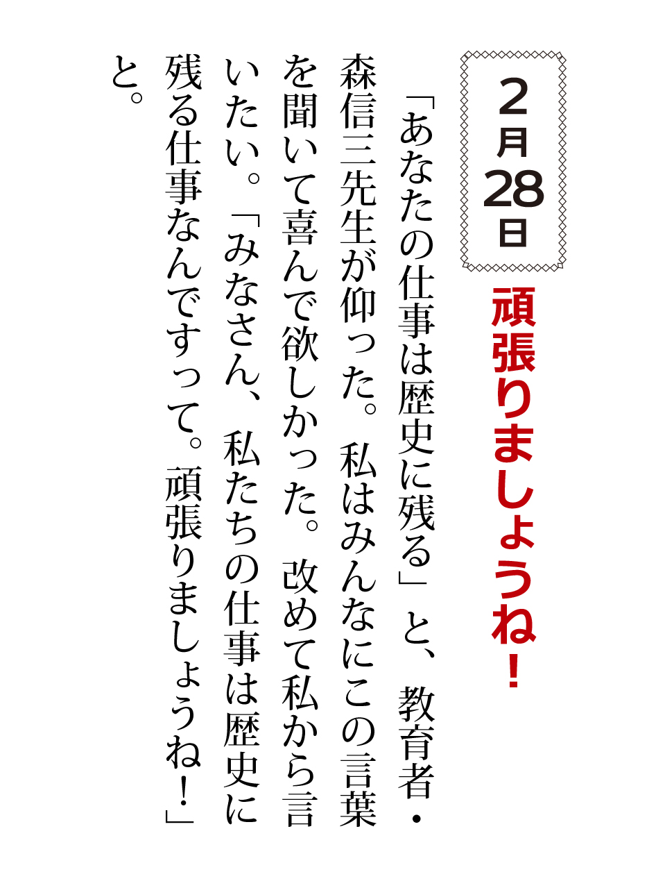 「あなたの仕事は歴史に残る」と、教育者・森信三先生が仰った。私はみんなにこの言葉を聞いて喜んで欲しかった。改めて私から言いたい。「みなさん、私たちの仕事は歴史に残る仕事なんですって。頑張りましょうね!」と。
