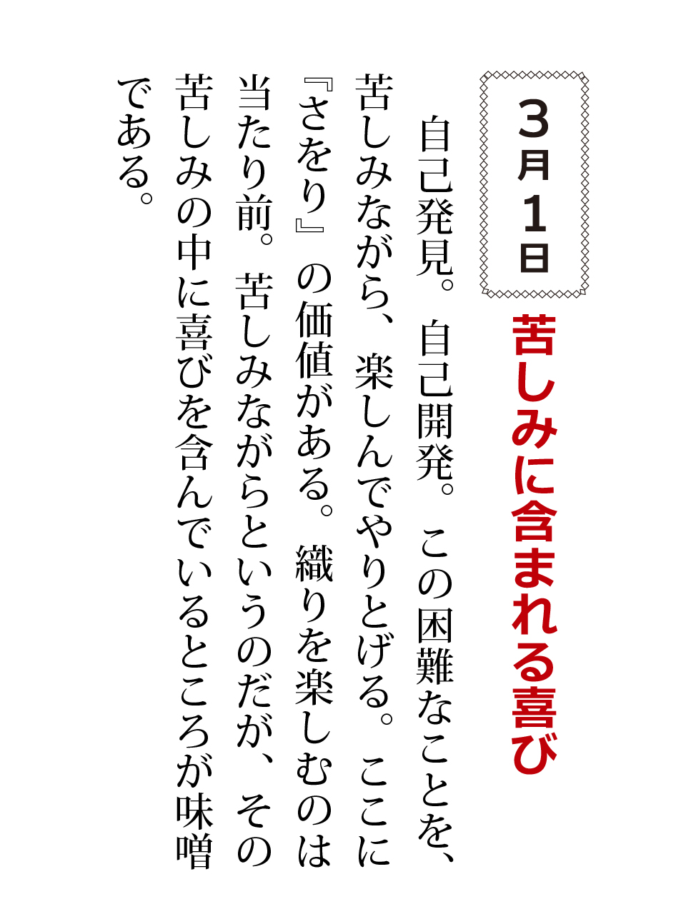 自己発見。自己開発。この困難なことを、苦しみながら、楽しんでやりとげる。ここに『さをり』の価値がある。織りを楽しむのは当たり前。苦しみながらというのだが、その苦しみの中に喜びを含んでいるところが味噌である。