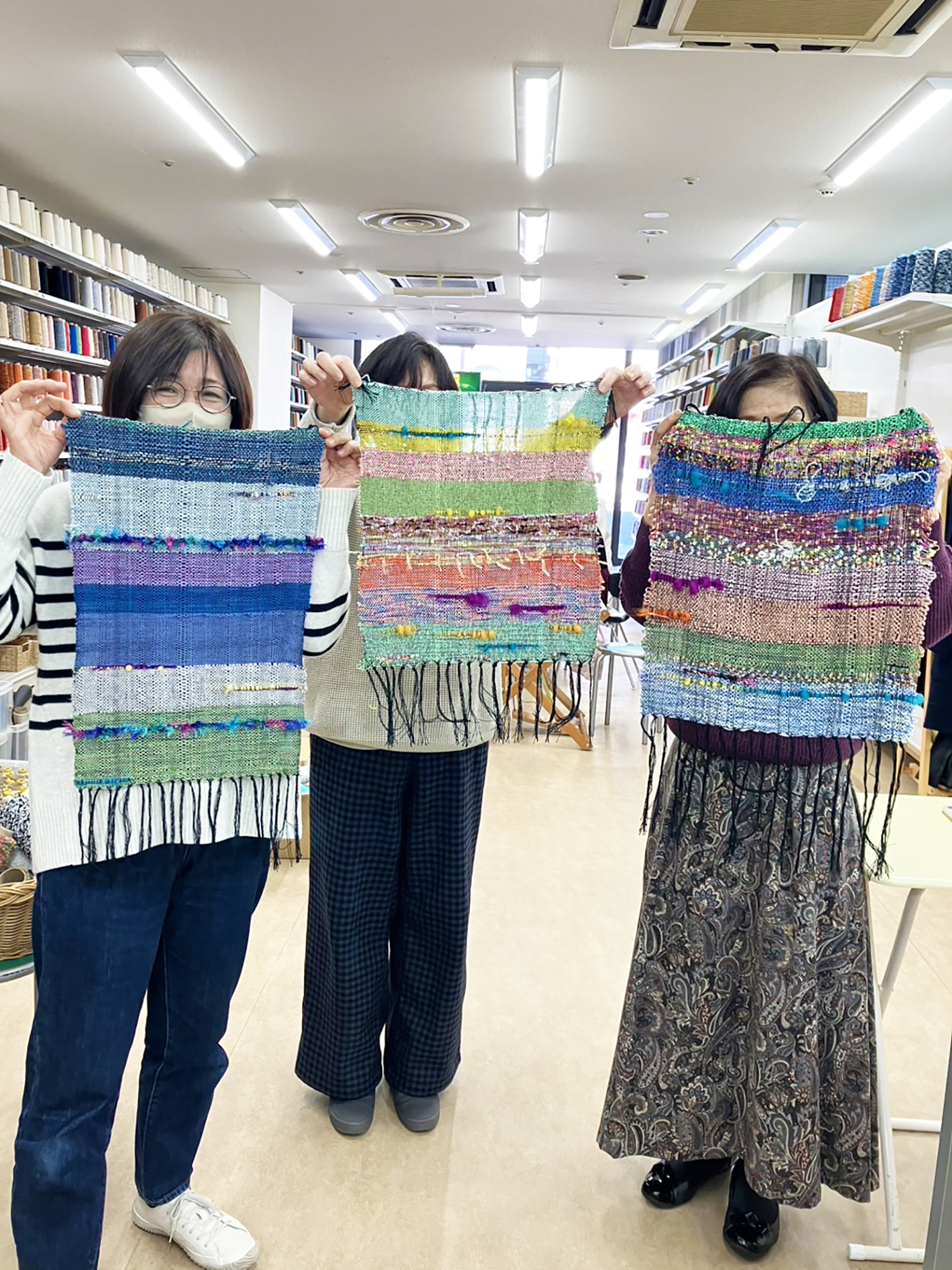 「手織りがしてみたくて探して来ました」という仲良し3人組さん。『2時間でランチョンマットを織る』で、初体験でした。