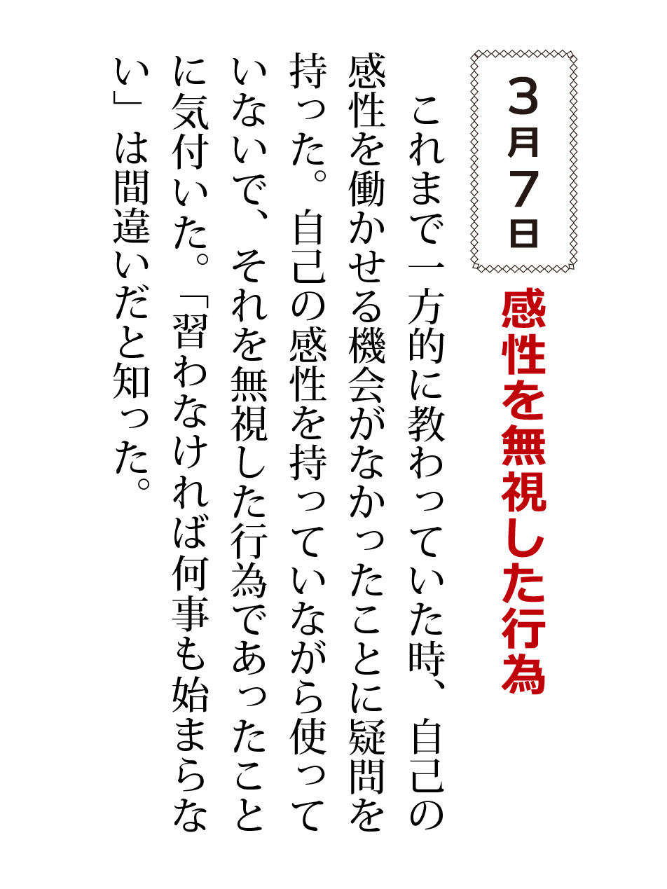 これまで一方的に教わっていた時、自己の感性を働かせる機会がなかったことに疑問を持った。自己の感性を持っていながら使っていないで、それを無視した行為であったことに気付いた。「習わなければ何事も始まらない」は間違いだと知った。