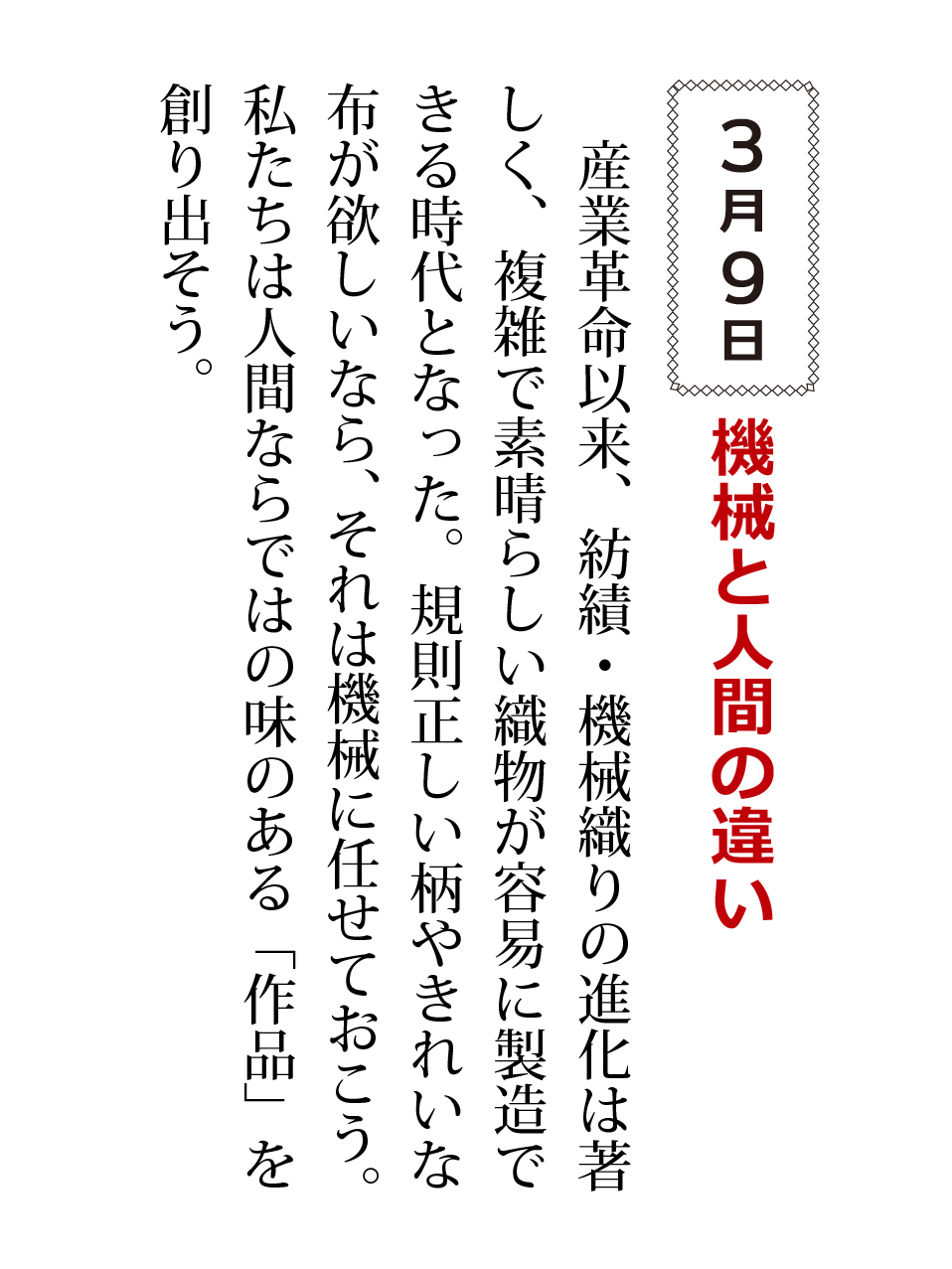 産業革命以来、紡績・機械織りの進化は著しく、複雑で素晴らしい織物が容易に製造できる時代となった。規則正しい柄やきれいな布が欲しいなら、それは機械に任せておこう。私たちは人間ならではの味のある「作品」を創り出そう。