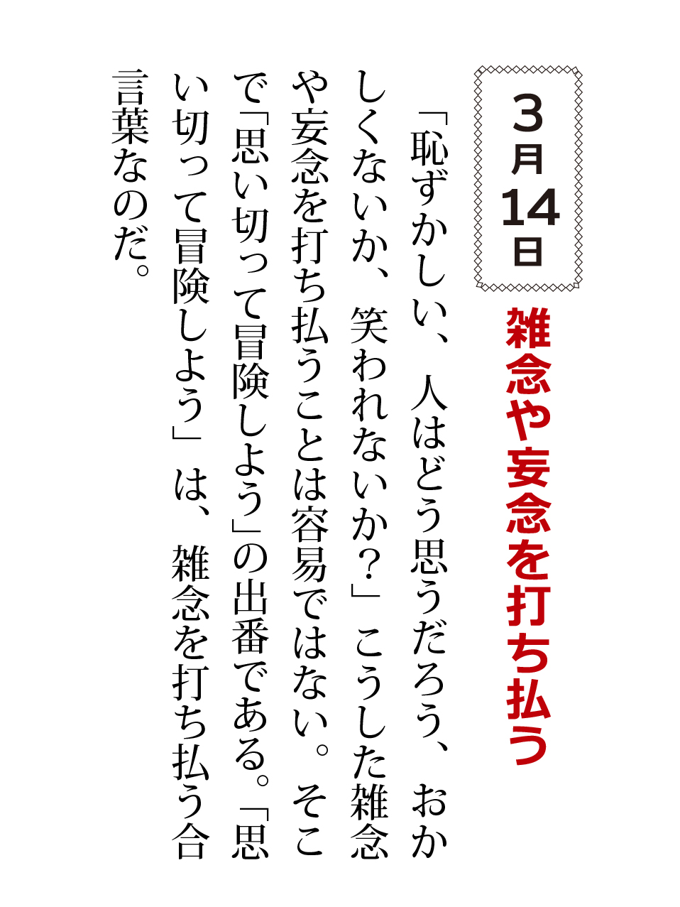 「恥ずかしい、人はどう思うだろう、おかしくないか、笑われないか?」こうした雑念や妄念を打ち払うことは容易ではない。そこで「思い切って冒険しよう」の出番である。「思い切って冒険しよう」は、雑念を打ち払う合言葉なのだ。