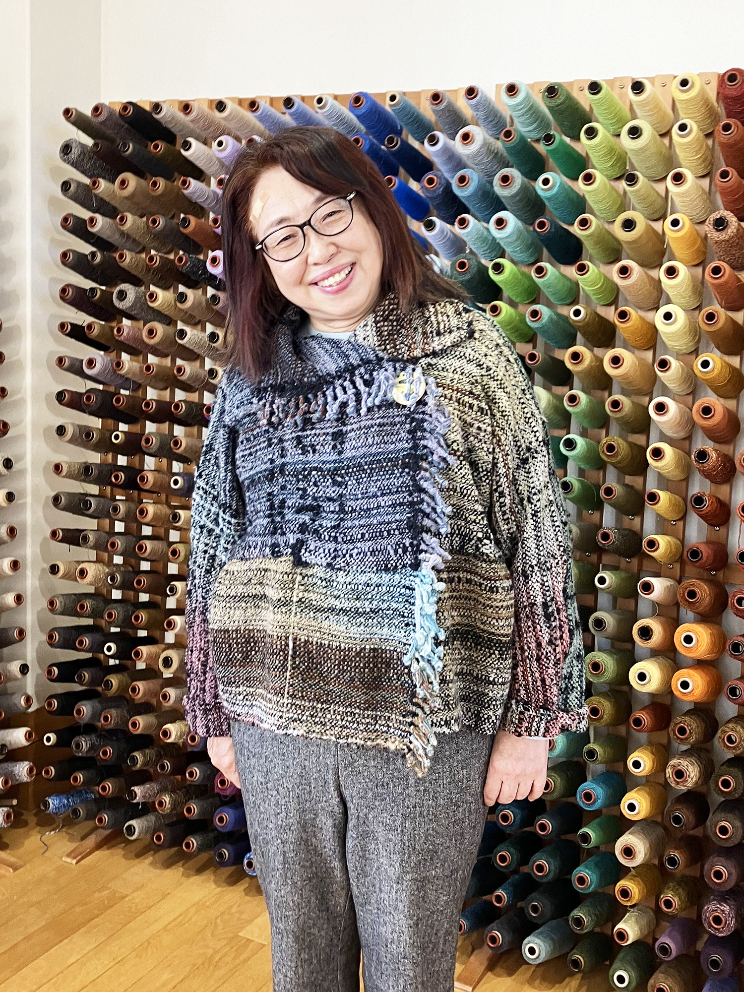 染めたウールのタテ糸で織った布を、ジャケットに仕立てました。グラデーションの美しさや、アクセントのフリンジで、パッと目を惹く一着です。