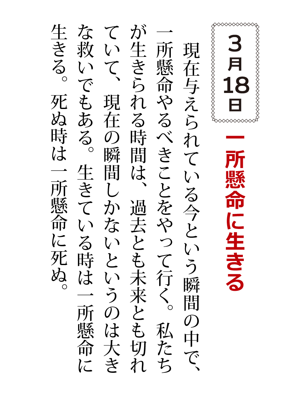 現在与えられている今という瞬間の中で、一所懸命やるべきことをやって行く。私たちが生きられる時間は、過去とも未来とも切れていて、現在の瞬間しかないというのは大きな救いでもある。生きている時は一所懸命に生きる。死ぬときは一所懸命に死ぬ。