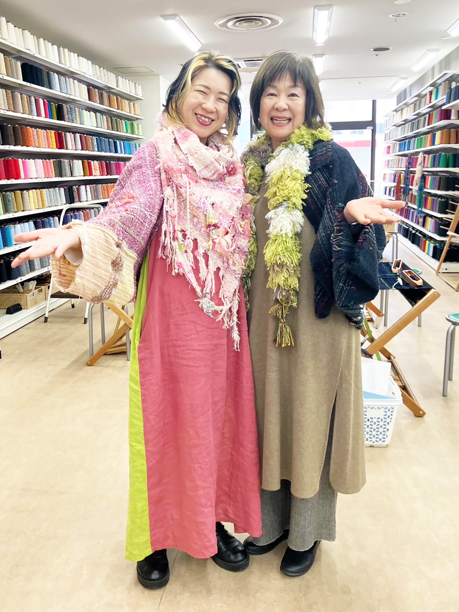 同じデザインでも、使う糸や織り方が変わると雰囲気が違うのはもちろんですが、お気に入りのマフラーも合わせたコーディネートとなると、それぞれの個性がますます発揮されて一層素敵です。