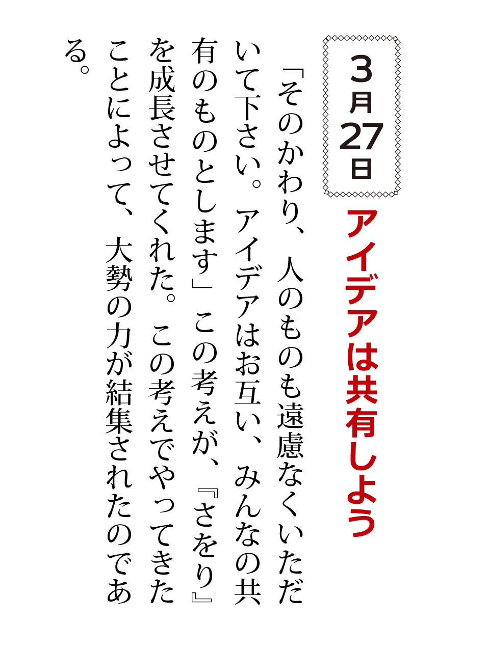 「そのかわり、人のものは遠慮なくいただいて下さい。アイデアはお互い、みんなの共有のものとします」その考えが、『さをり』を成長させてくれた。この考えでやってきたことによって、大勢の力が結集されたのである。