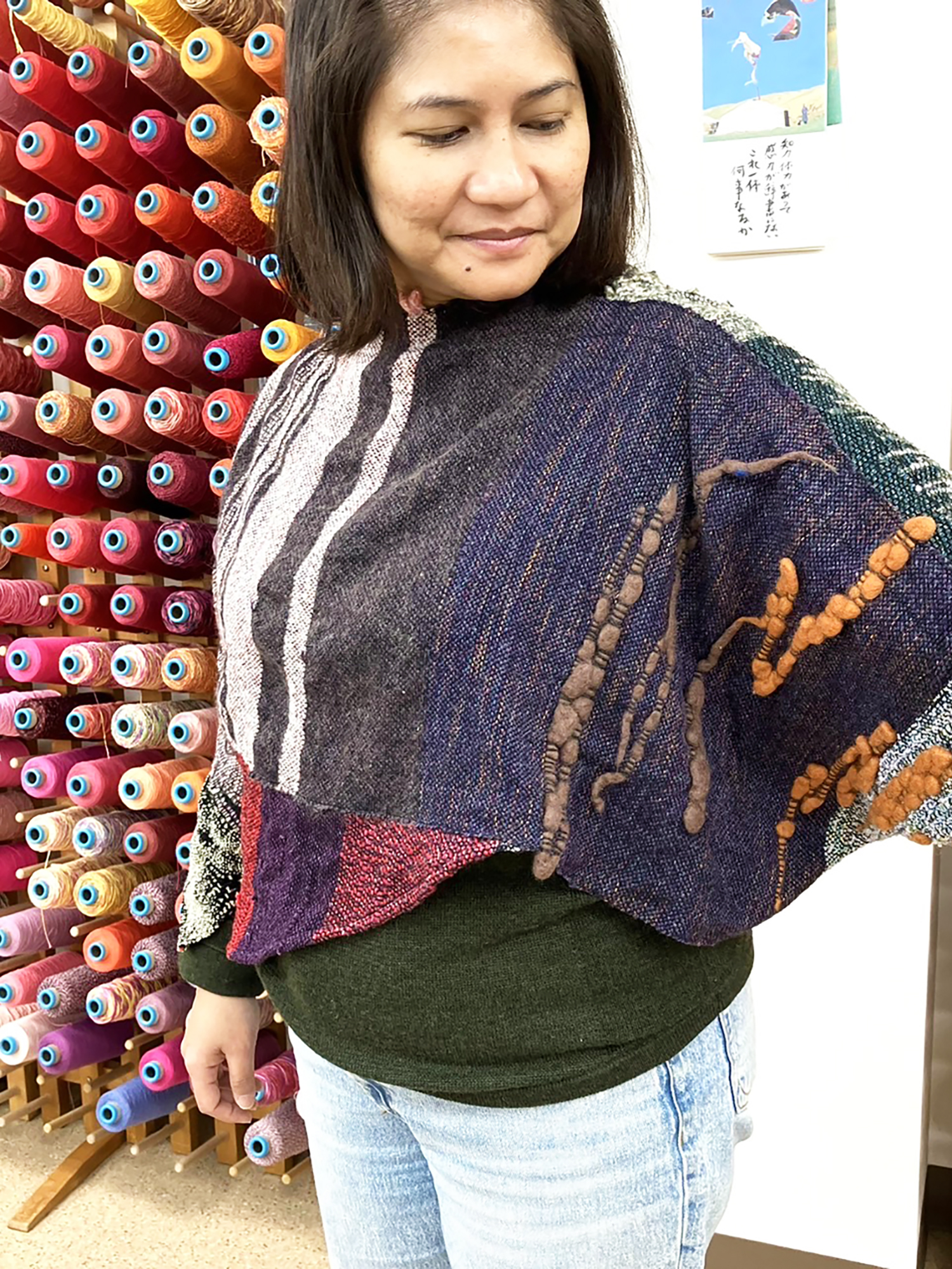 SAORIのお仕立て【初級編】に掲載の『長袖三角ブラウス』が完成しました。織り技をたくさん入れた布を使って、さらにアレンジで裾に余った布を足しました。