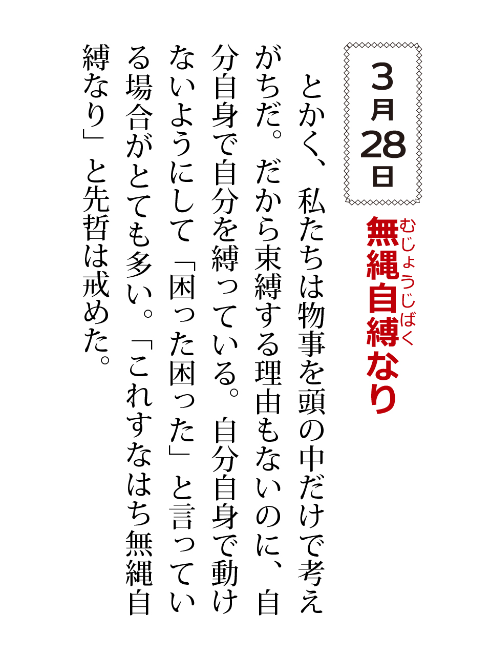 とかく、私たちは物事を頭の中だけで考えがちだ。だから束縛する理由もないのに、自自分自身で自分を縛っている。自分自身で動けないようにして「困った困った」と言っている場合がとても多い。「これはすなはち無縄自縛なり」と先哲は戒めた。