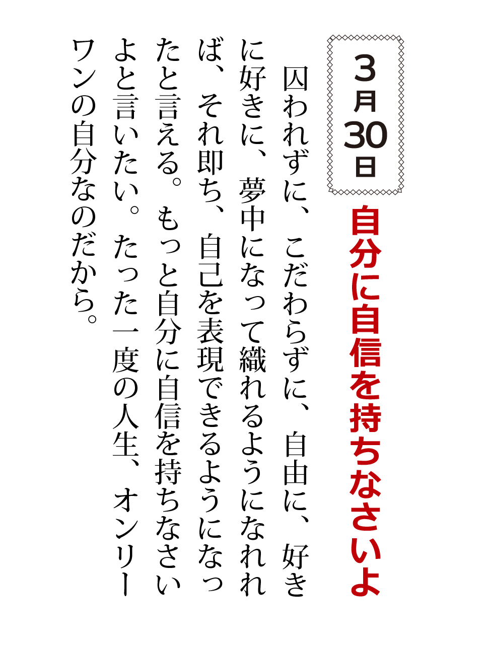 囚われずに、こだわらずに、自由に、好きに好きに、夢中になって織れるようになれれば、それ即ち、自己を表現できるようになったと言える。もっと自分に自信を持ちなさいよと言いたい。たった一度の人生、オンリーワンの自分なのだから。
