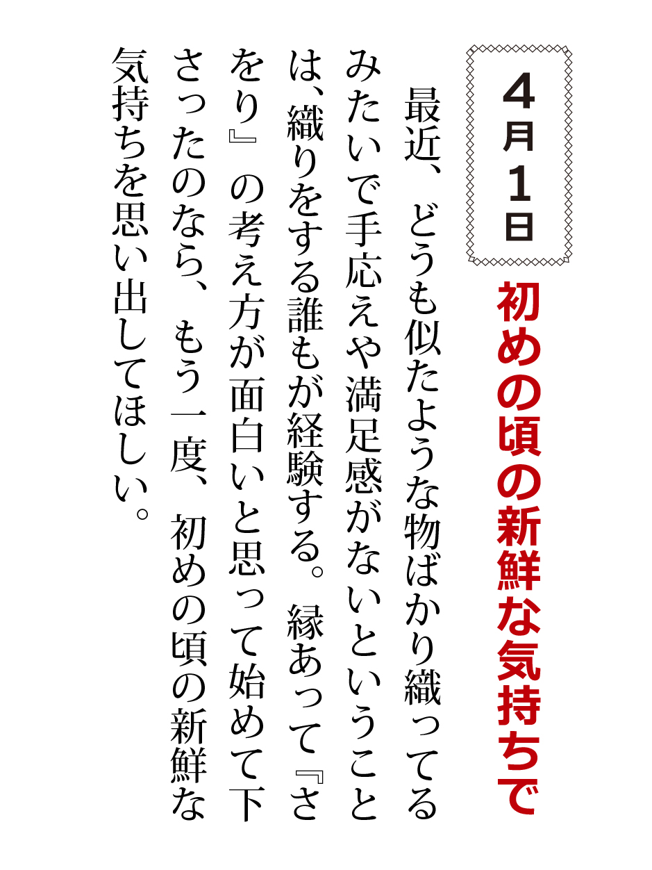 最近、どうも似たような物ばかり織っているみたいで手応えや満足感がないということは、織りをする誰もだ経験する。縁あって『さをり』の考え方が面白いと思って始めて下さったのなら、もう一度、初めの頃の新鮮な気持ちを思い出してほしい。