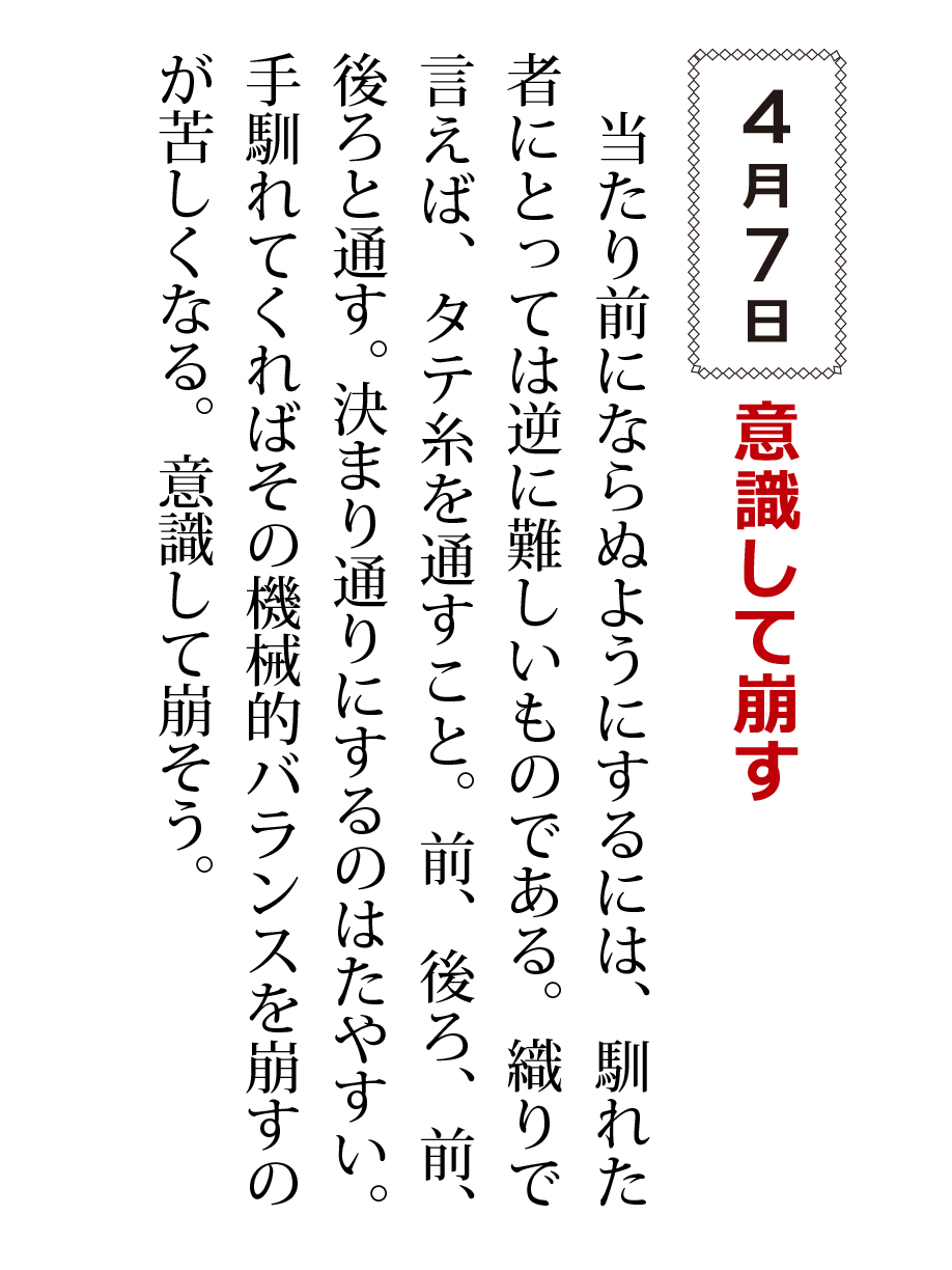 当たり前にならぬようにするには、馴れた者にとっては逆に難しいものである。織りで言えば、タテ糸を通すこと。前、後ろ、前、後ろと通す。決まり通りにするのはたやすい。手慣れてくればその機械的バランスを崩すのが苦しくなる。意識して崩そう。