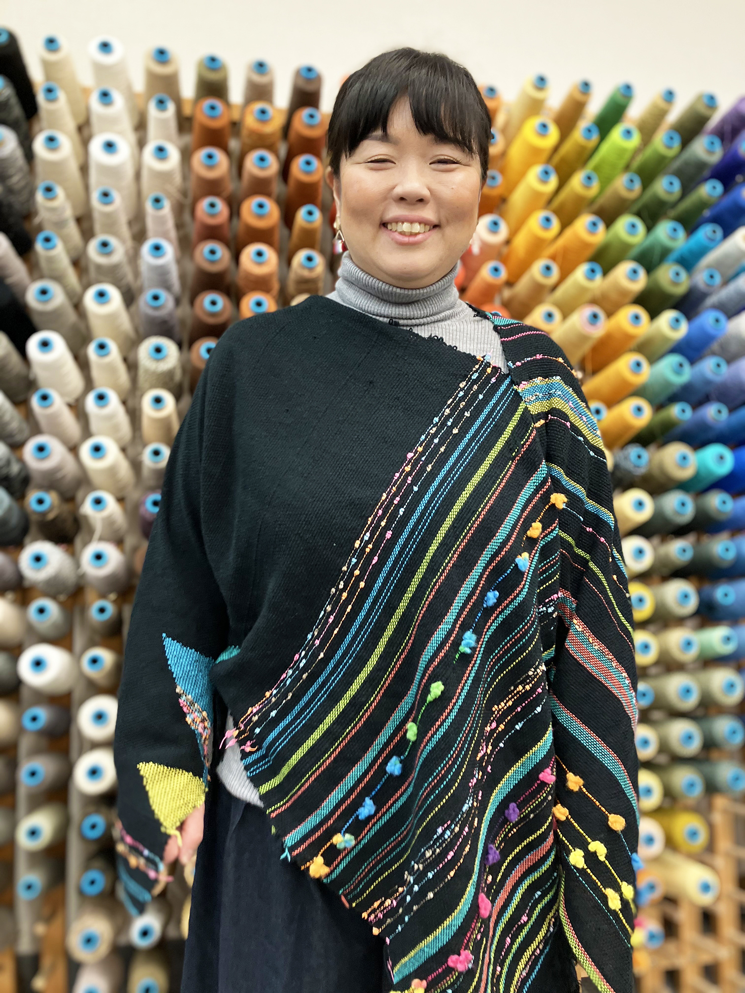 定番タテ糸ローラー巻き(TRM)を活かして、カラフルな部分とのコントラストが美しい布が織り上がりました。『SAORIのお仕立て【初級編】』に掲載の『正方形を折りたたむ長袖三角ブラウス』に仕立てたところ、ちょうど袖口に二色交差の部分がきて、ますます布の個性が引き出されました。