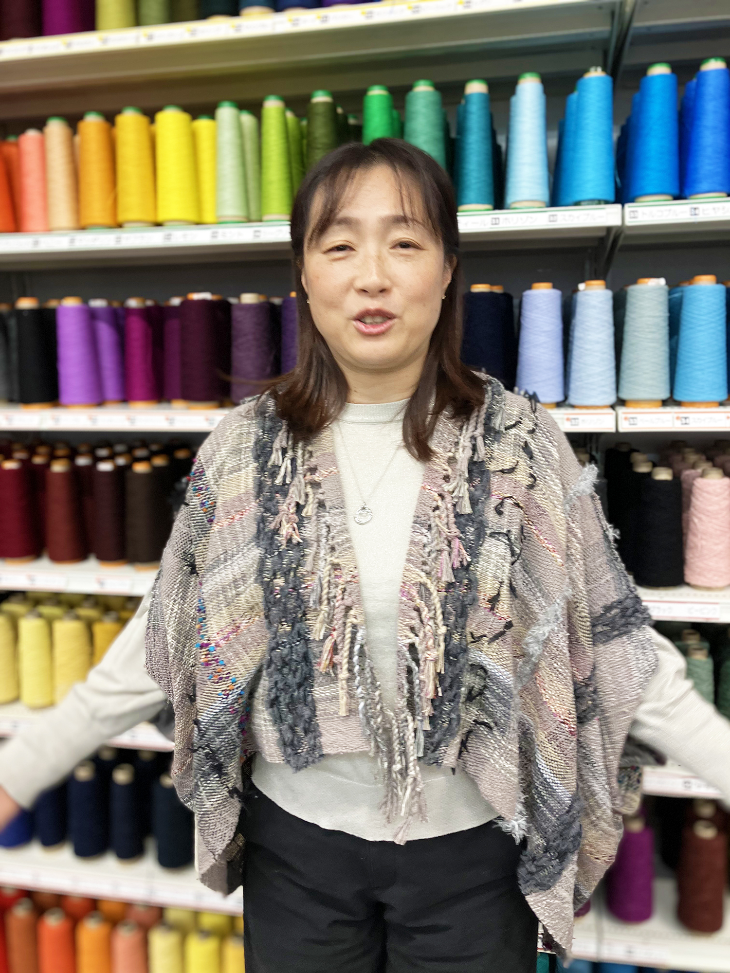 『SAORIのお仕立て【初級編】』に掲載の『ロングストールでできる襟付きマーガレット』が完成しました。フリンジやぴゃむぴゃむやーんがアクセントになって、優しい色合いながらも、華やかな印象の一着となりました。