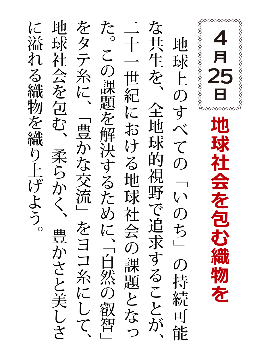 地球上のすべての「いのち」の持続可能な共生を、全地球的視野で追及することが、二十一世紀における地球社会の課題となった。この課題を解決するために、「自然の叡智」をタテ糸に、「豊かな交流」をヨコ糸にして、地球社会を包む、柔らかく、豊かさと美しさに溢れる織物を織り上げよう。