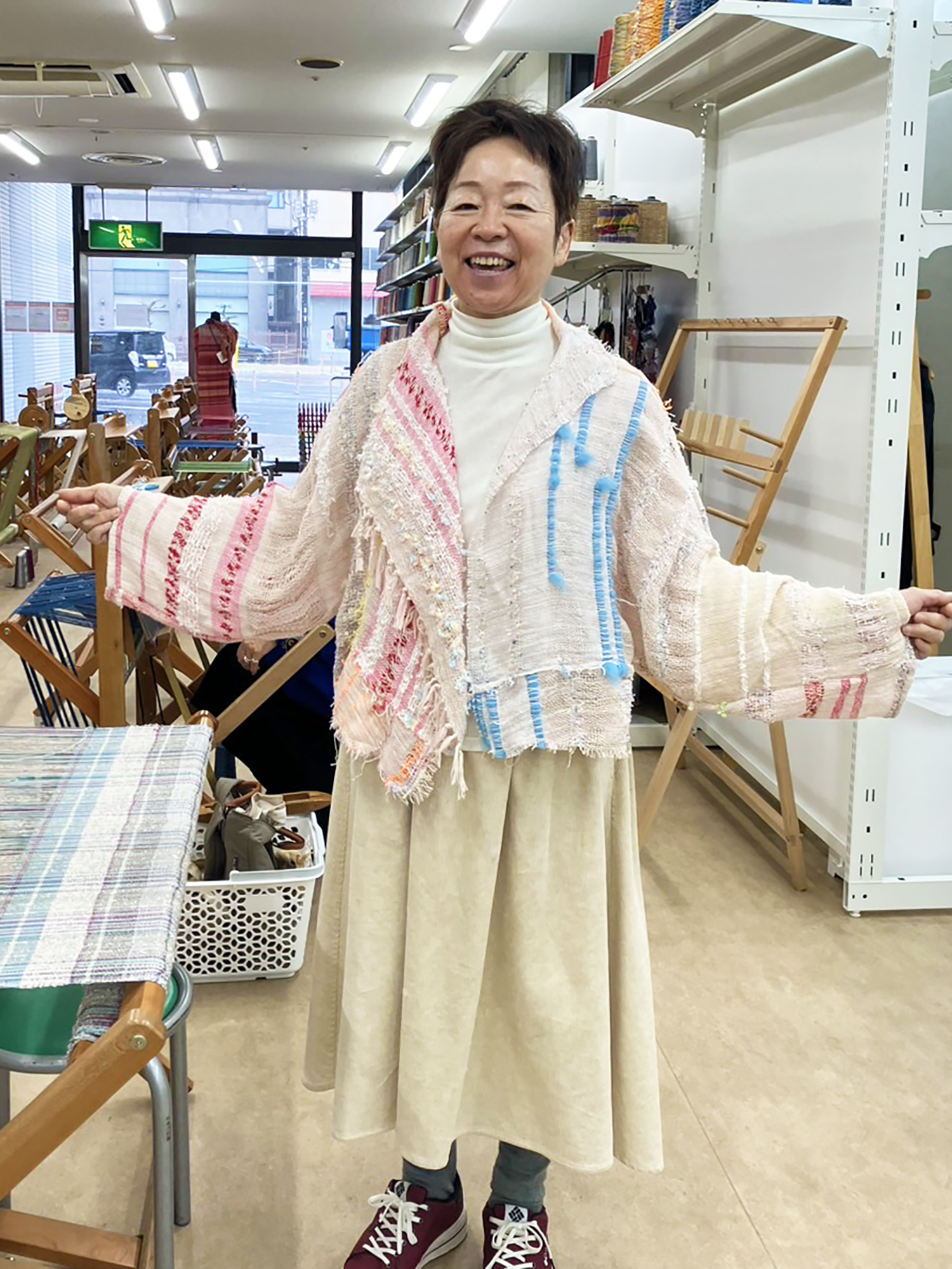 「春物の袖付きの羽織ものが欲しいなぁ」と、縮絨した布を持ってこられました。スタッフの作品を参考に仕立てられたのがこちら。理想的な柔らかい羽織ものとなりました。