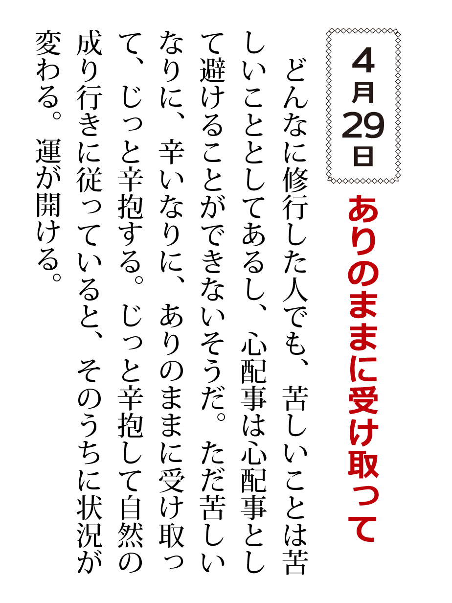 どんなに修業した人でも、苦しいことは苦しいこととしてあるし、心配事は心配事として避けることができないそうだ。ただ苦しいなりに、辛いなりに、ありのままに受け取って、じっと辛抱する。じっと辛抱して自然の成り行きに従っていると、そのうちに状況が変わる。運が開ける。